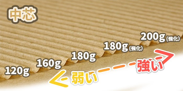 強化中芯は、同じ坪量でも薬剤等を使用し強度を上げたものです。 普通中芯よりも強化中芯の方が価格が高いです。