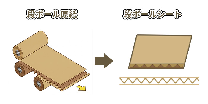 段ボールシートは平らな紙(ライナー)と波状の紙(中芯)が接着剤で貼合され、1つの構造体となっています。